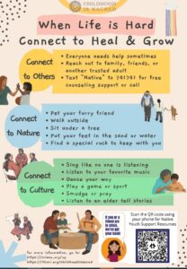 Research and evidence by several sources, including the Center for Disease Control shows that enhanced connections to caring adults and increased parent and youth skills to manage emotions and conflicts using approaches in schools and other settings can reduce the effects of Adverse Childhood Experiences (ACEs). It is also important for everyone in community to recognize the challenges that families face and offer support and encouragement to reduce stress. In addition, spending time in nature and, especially for Native American children, learning about and participating in cultural practices and activities are protective resilience building factors.